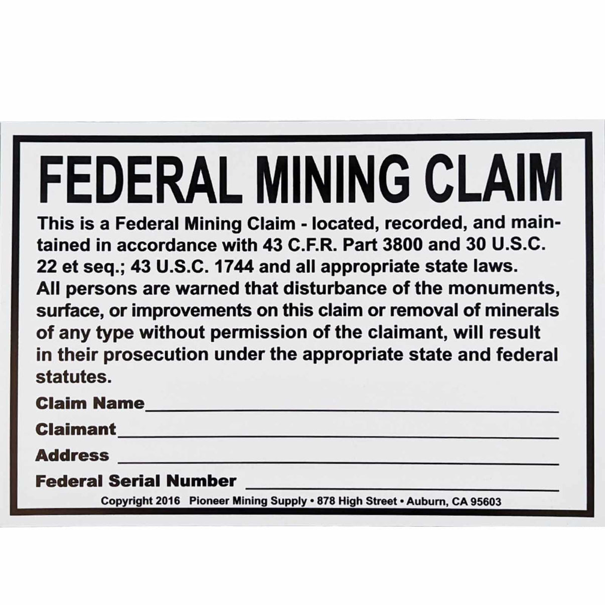 The Federal Mining Claim Sign is 12 inches wide and 8 inches tall which makes it obvious that this is an active mining claim.