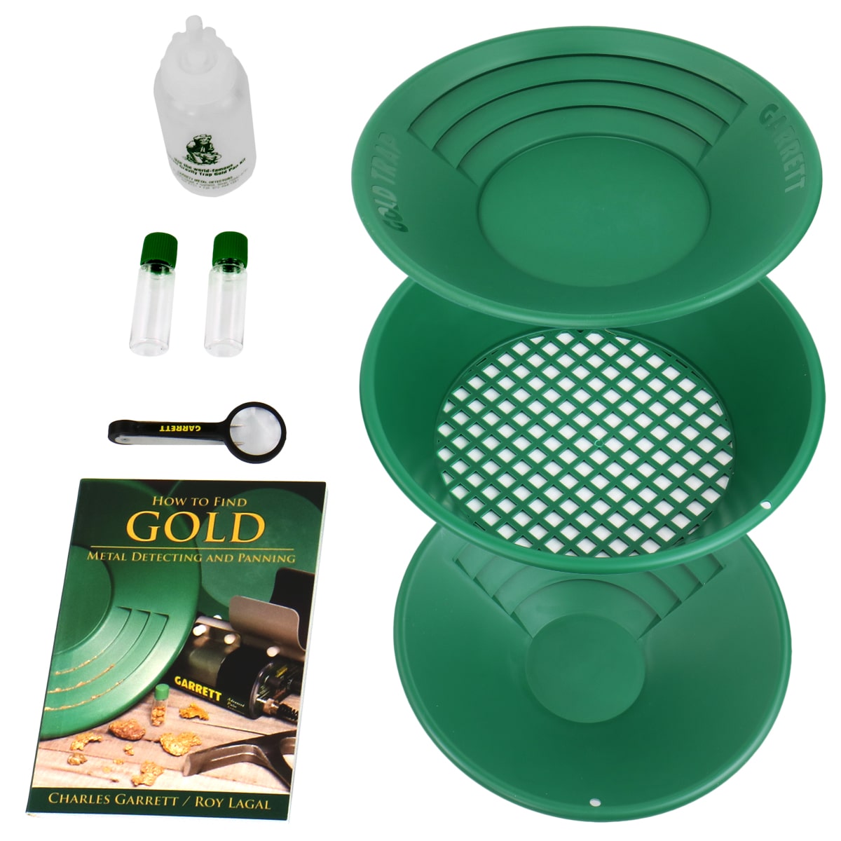 This bundle includes a 14″ Prospector Pan, 10″ Backpacker Pan, Classifier / Sifter, Gold Guzzler Bottle, 2 Gold vials, Tweezers, and ‘How to Find Gold’ field guide by Charles Garrett and Roy Lagal.