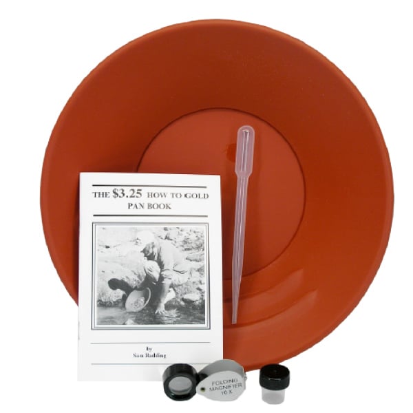 This kit includes the Archer 10 inch plastic gold pan, a suction tweezer to pick the gold out of the pan, a handy vial to display the gold, and a very good how-to-pan book. Everything you need to be on your way to being a proficient gold hound.