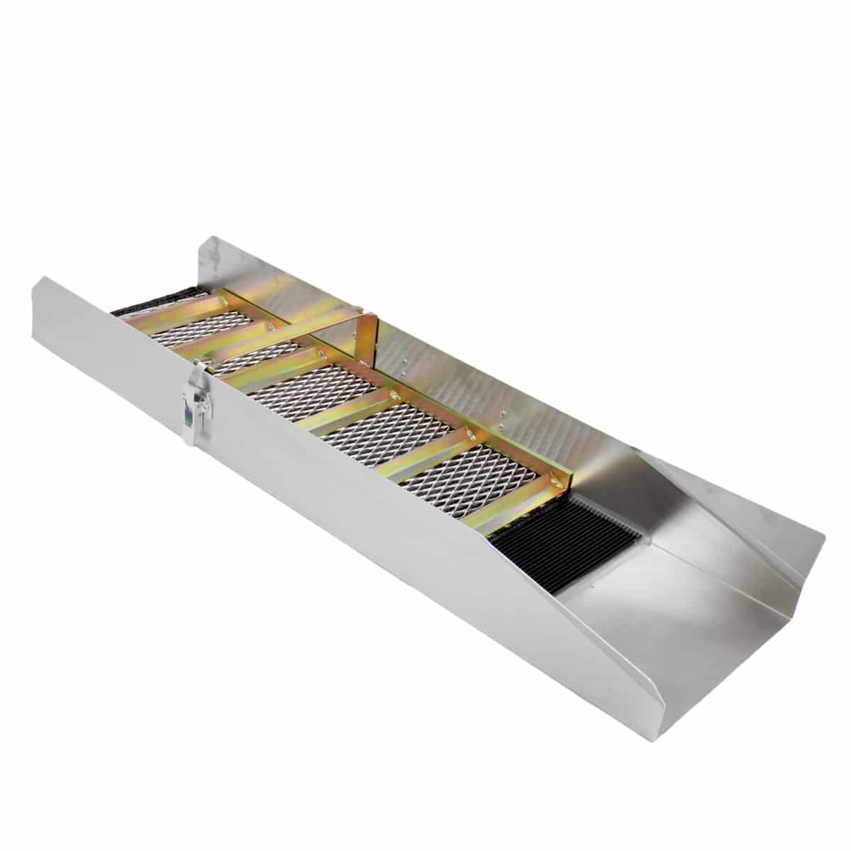 Two different types of riffles on this sluice were designed for superior recovery under different water and gravel conditions. The first few riffles are stream riffles, which are shorter and designed to work with minimum water flow. Stream riffles make it easier for the water to start to move the material. Hungarian riffles work better with a more aggressive volume of water. Together, both types of riffles are designed to create turbulence that deposits the gold and other heavier values behind them.