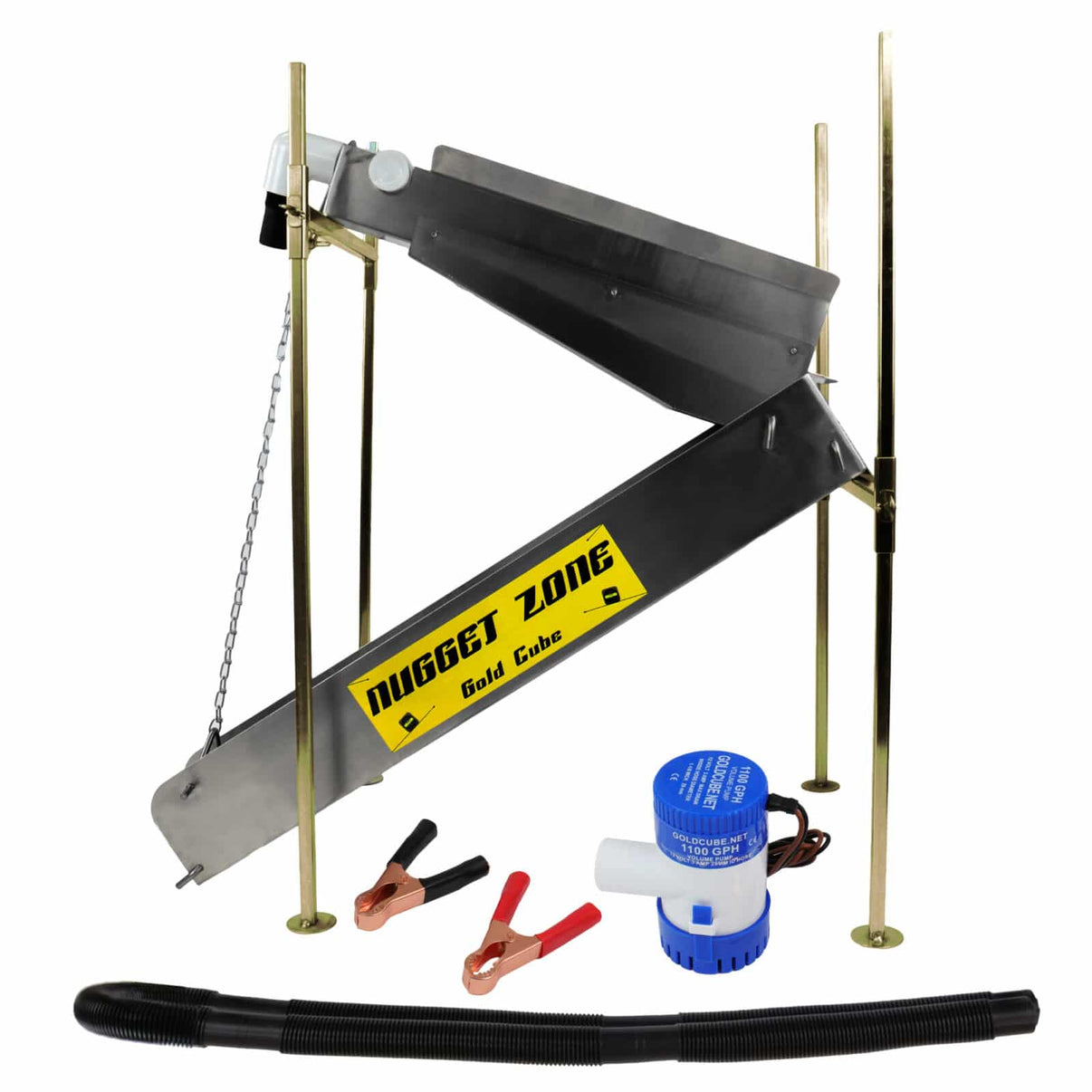 Get in the Zone that captures the big gold! The newest addition to the Gold Cube family adds the ability to easily capture the larger gold your Trommel or Gold Banker may miss. The Gold Cube was designed to effectively capture fine gold and no other product on the market does it better however, when used as a high banker or just running concentrates the Nugget Zone can easily get larger gold the punch plate holes may miss. The Nugget Zone easily attaches to it’s own stand attachment and uses a separate 1100 pump. The perfect companion to the Gold Banker and Trommel.