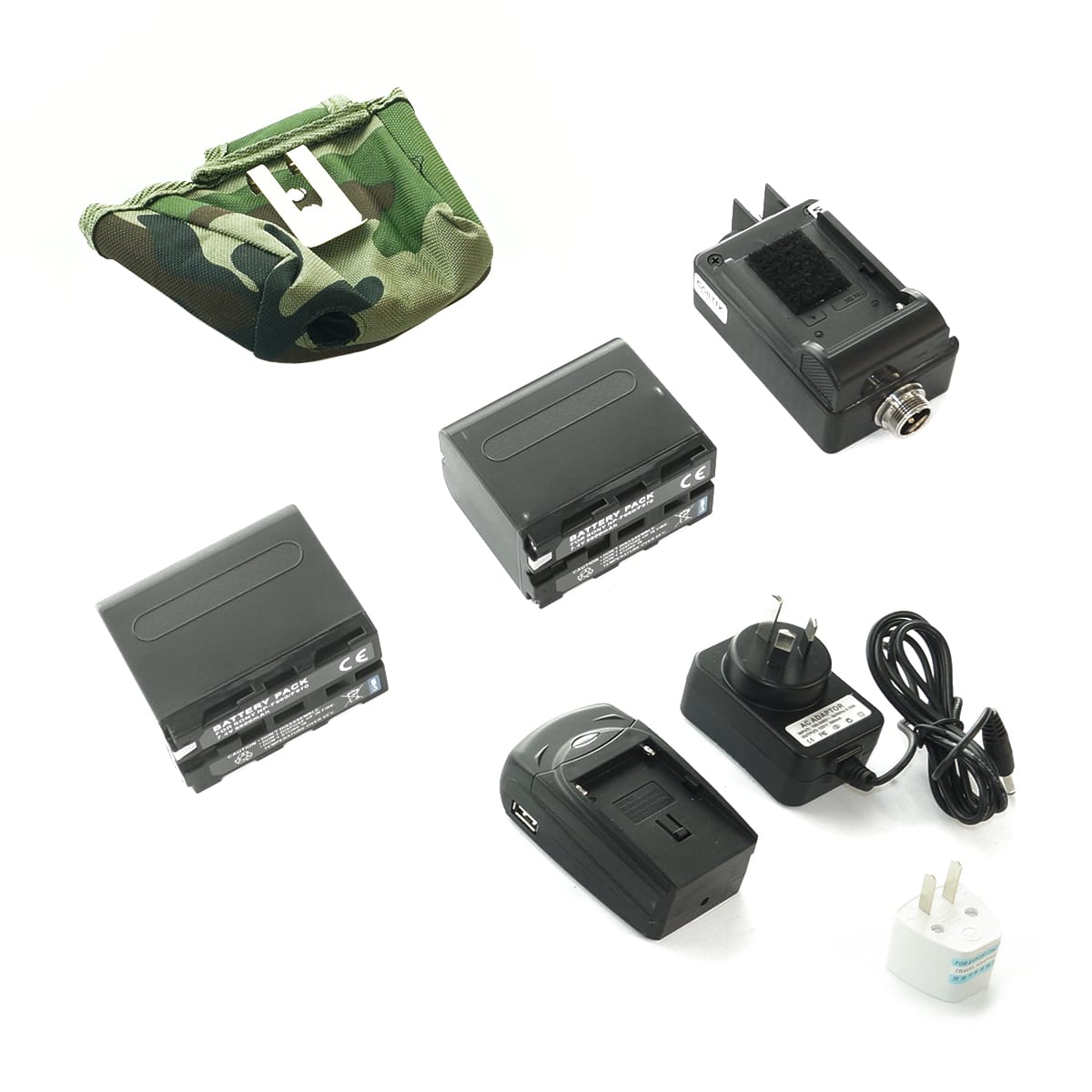 • Includes: 2 Li-Ion 7.3/6.7 volt batteries,  6 in 1 Digital Multi-function Charger, and a small camo pouch.