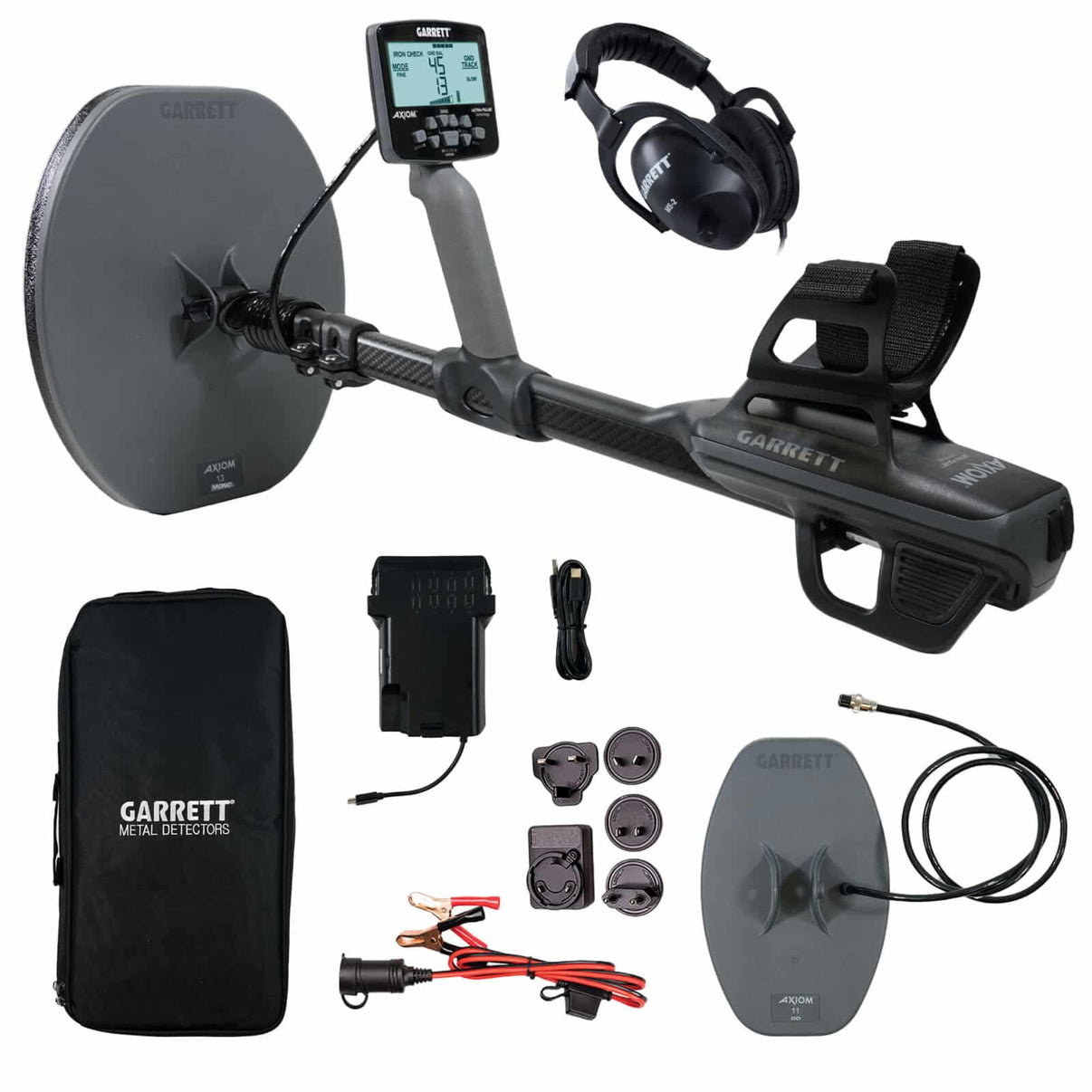 Garrett Axiom Metal Detector with 13″x11″ Mono Coil, 11″x7″ DD Coil and MS-2 Headphones