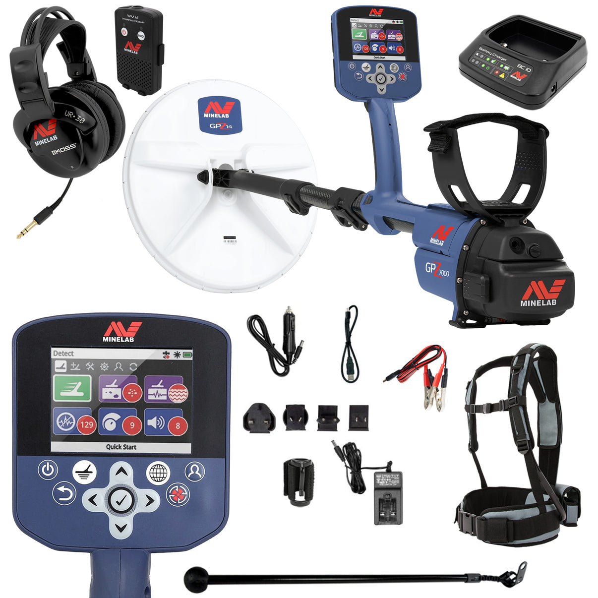 Minelab GPZ 7000 All Terrain Gold Metal Detector with waterproof 14″ x 13″ Super‑D Configuration Coil, Coil Cover, Koss Headphones, WM12 Wireless Headphone Module, and Minelab Li-ion Rechargeable Battery Pack.