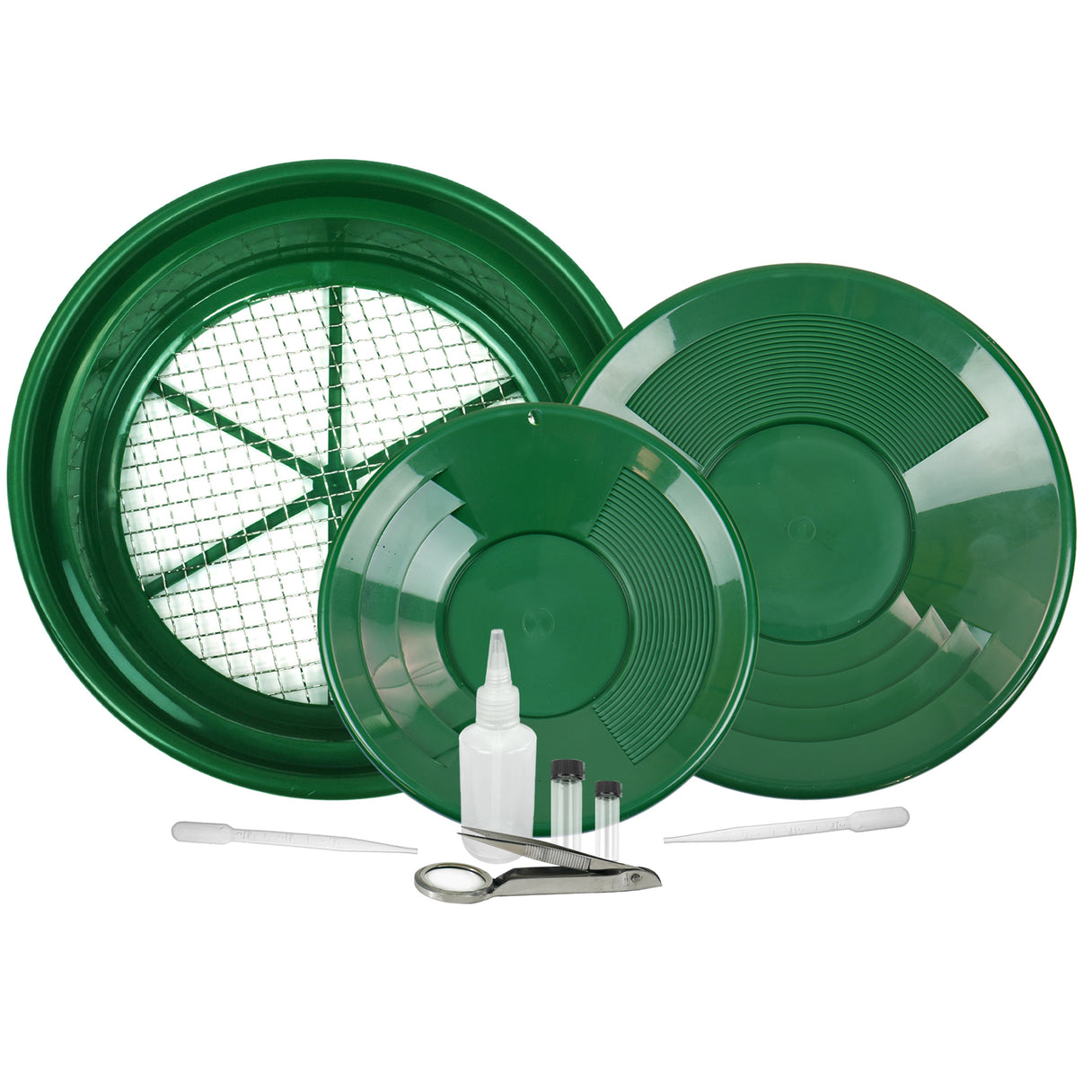 Designed for both beginner and experienced gold prospectors, this kit provides all the tools to start panning. Featuring a dual pan setup, precision tools, and a rugged classifier, this set is ideal for streamside prospecting or at-home concentrate recovery.