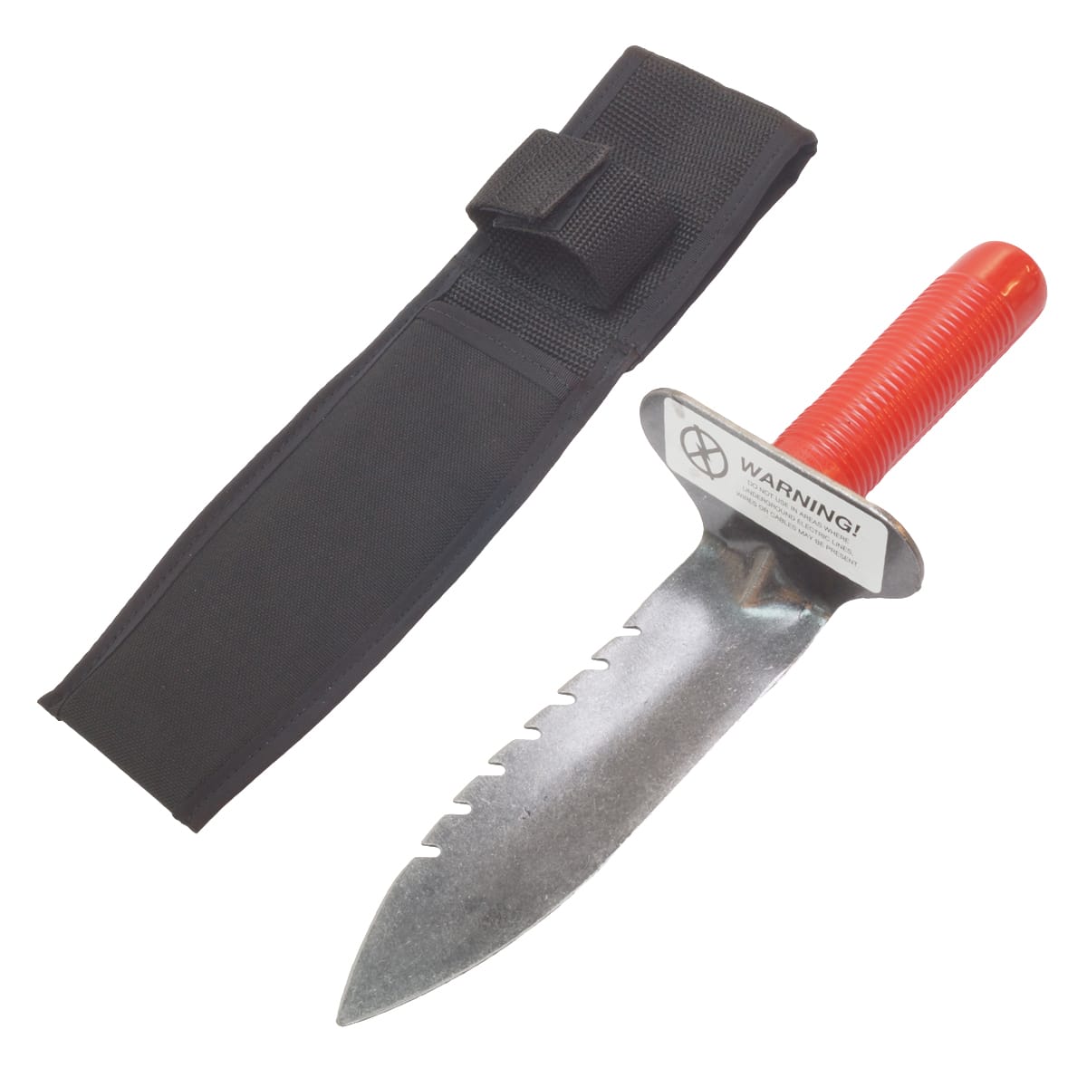 This double-edged digger has a saw tooth edge on one side to cut through roots and a sharpened edge on the other to cut through tuff grass and dirt. The Lesche digging tool has a comfortable rubber grip handle with hand guard plate. Will cut plugs in soil quickly. The digger is 12" overall and made in the USA out of Chrome-Moly steel. Comes with a Cordura belt sheath.