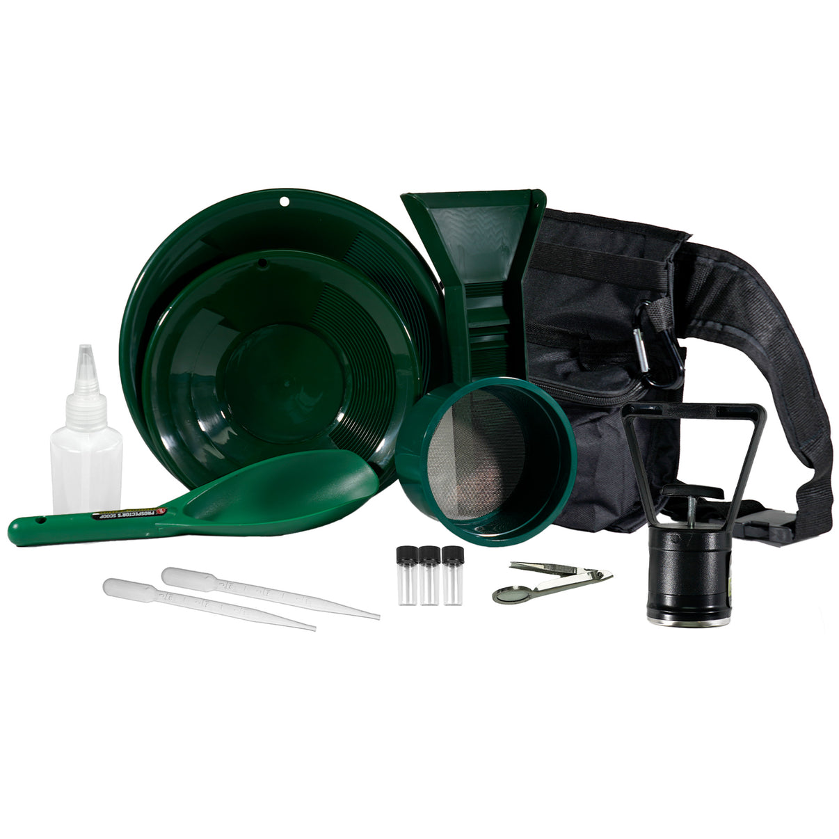 This comprehensive gold panning set equips you with all the essential tools for successful prospecting. It includes a Pocket Sluice Box, 10” and 12” prospecting pans, three glass vials, folding magnifier tweezers, a scoop, two pipettes, a mini classifier, a storage pouch, a magnetic separator tool, and a snifter bottle. Perfect for uncovering gold and precious minerals with precision and ease!