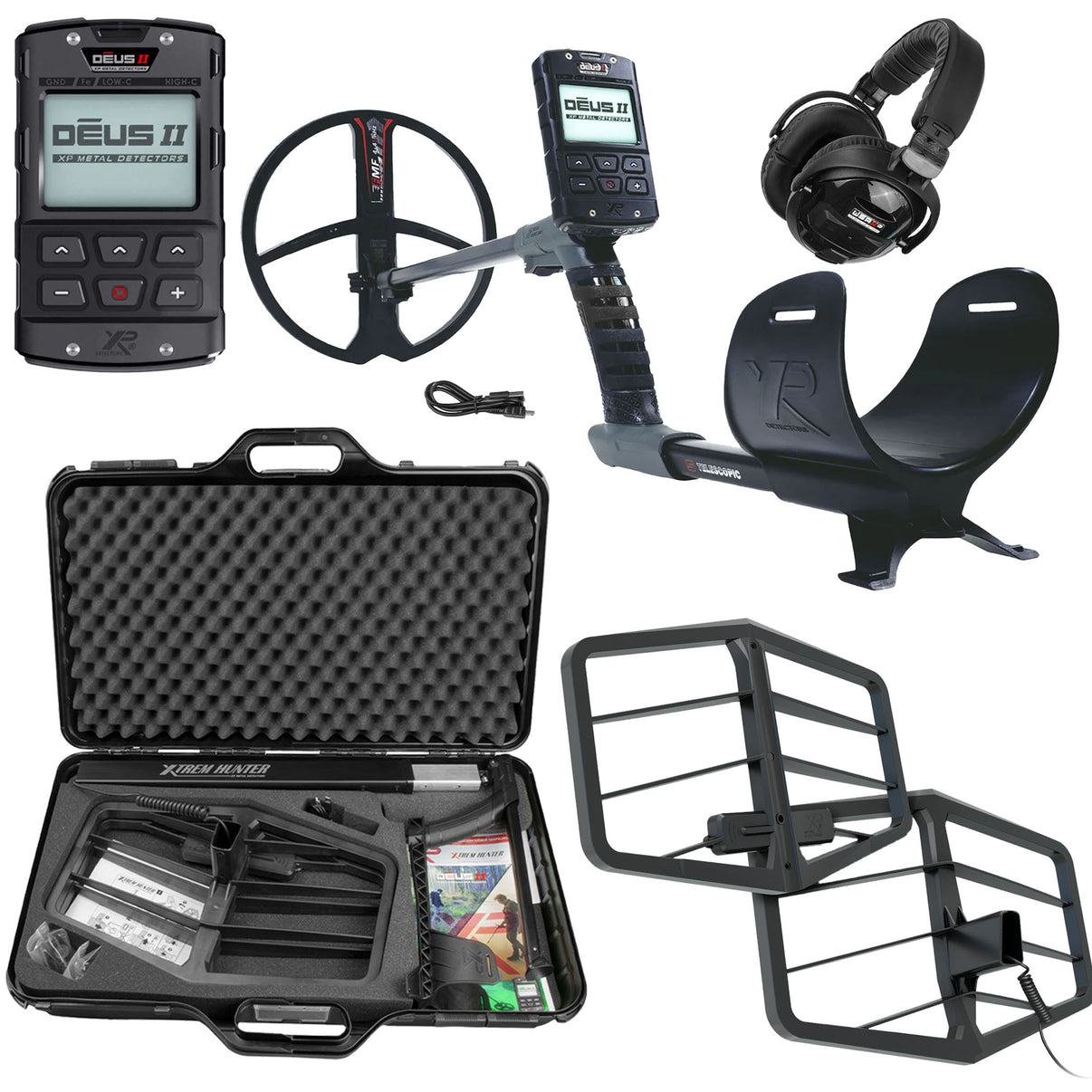 XP Deus II Metal Detector with RC, 11" Coil, WSAII-XL Headphones, and Xtrem Hunter Deep Seeking Coil Bundle.
