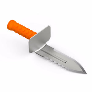 Quest Stainless Steel Diamond Digging Tool with Right Side Serrated blade when holding it.