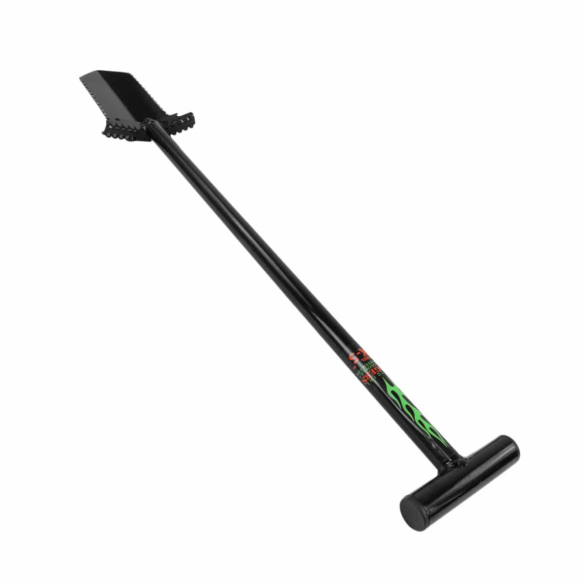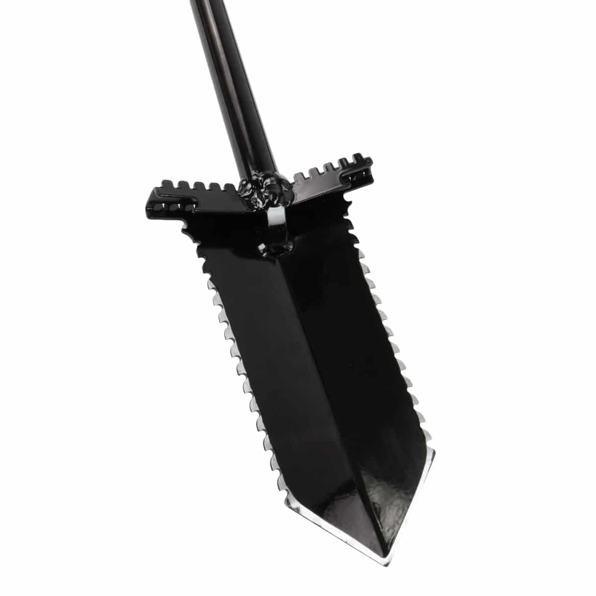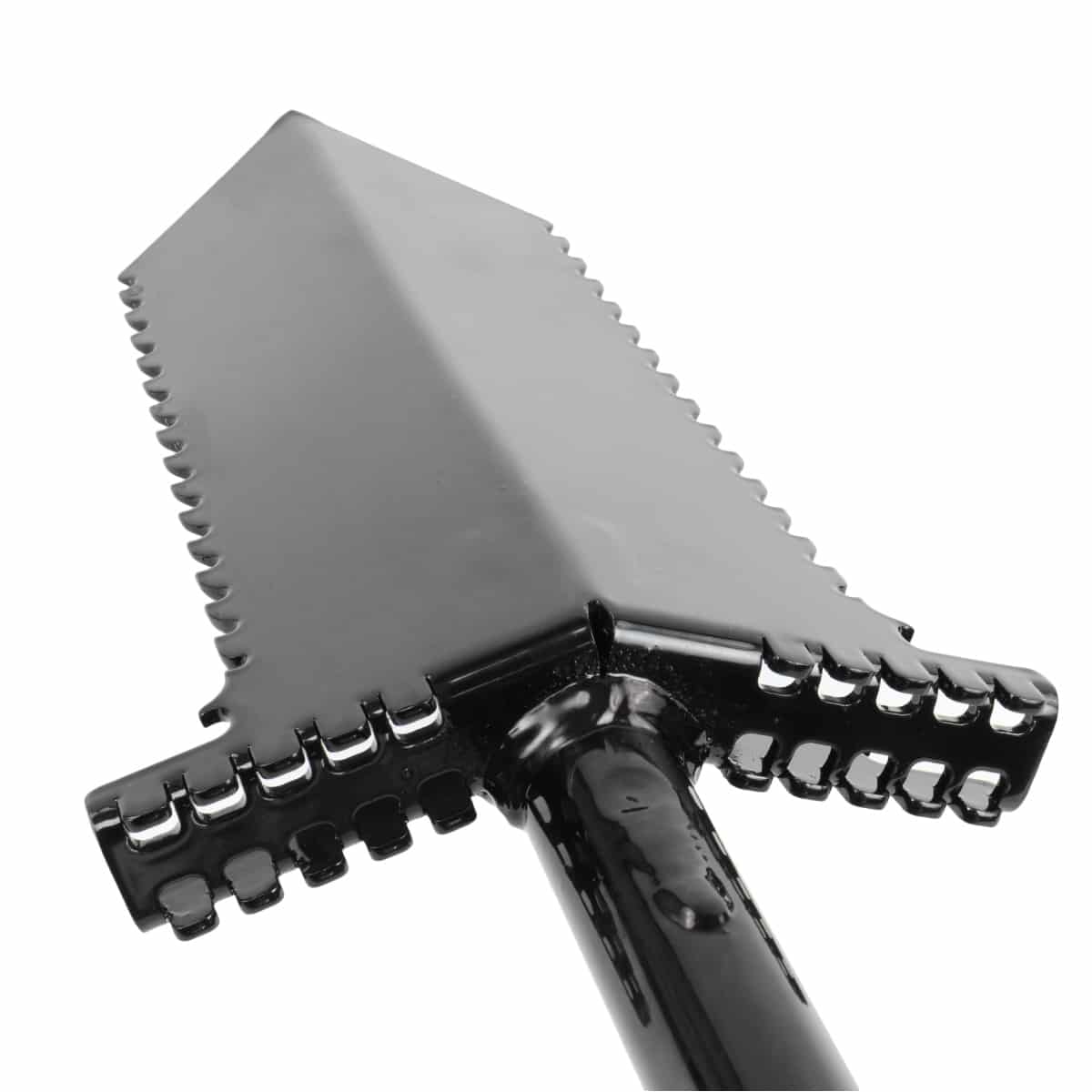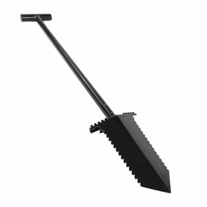 This shovel is made from tempered steel and heat treated for durability. The 30.75" shovel is powder coated black and the 9" blade has teeth on each side to cut roots. The handle is made to fit a standard 5.5" shovel holster. Also includes a built-in, double-sided bottle opener! Made in the USA.
