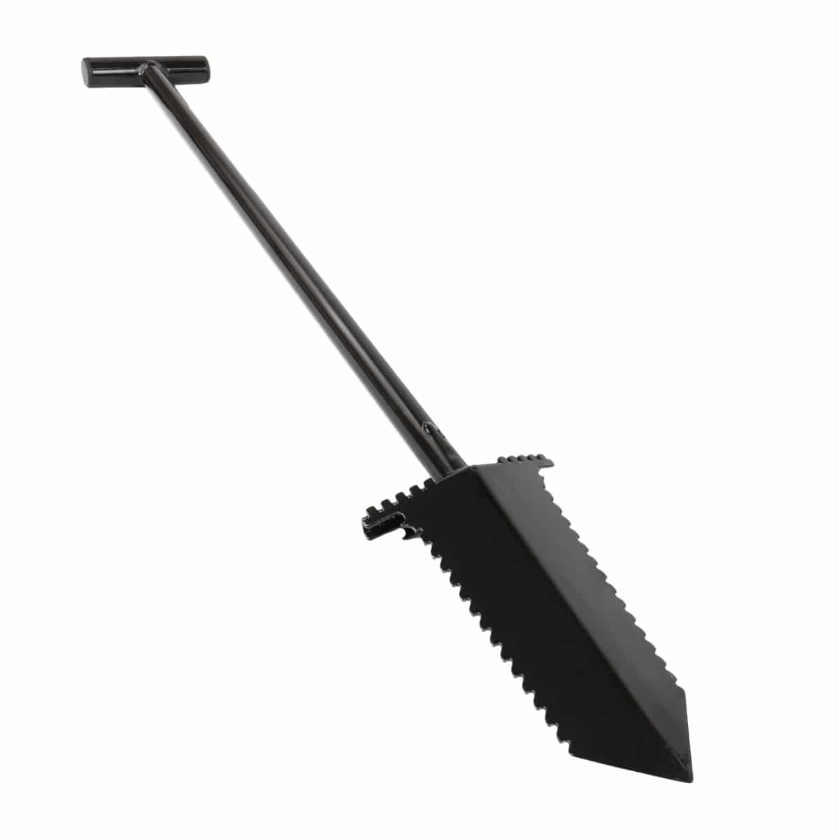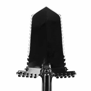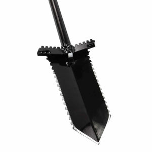 This shovel is made from tempered steel and heat treated for durability. The 36" shovel is powder coated black and the 9" blade has teeth on each side to cut roots. The handle is made to fit a standard 5.5" shovel holster. Also includes a built-in, double-sided bottle opener! Made in the USA.
