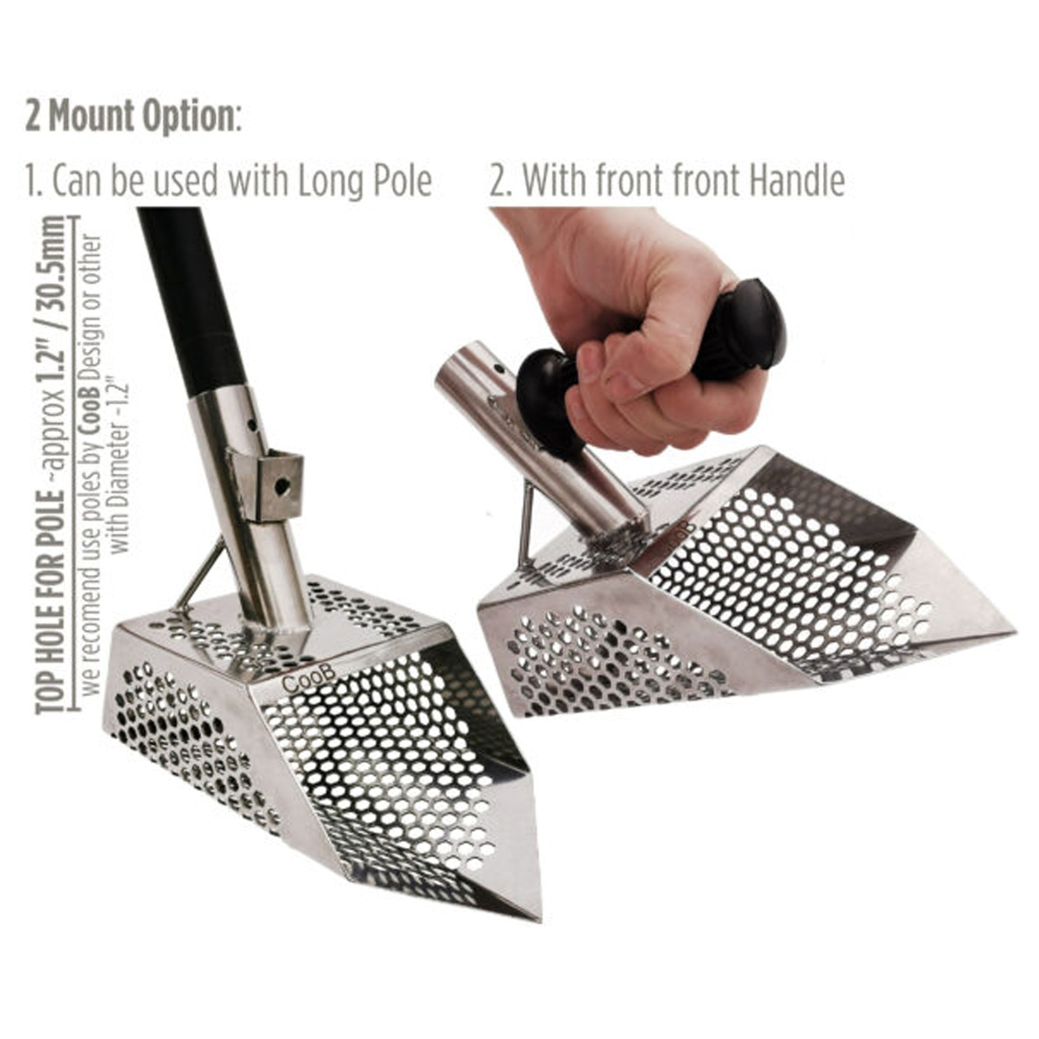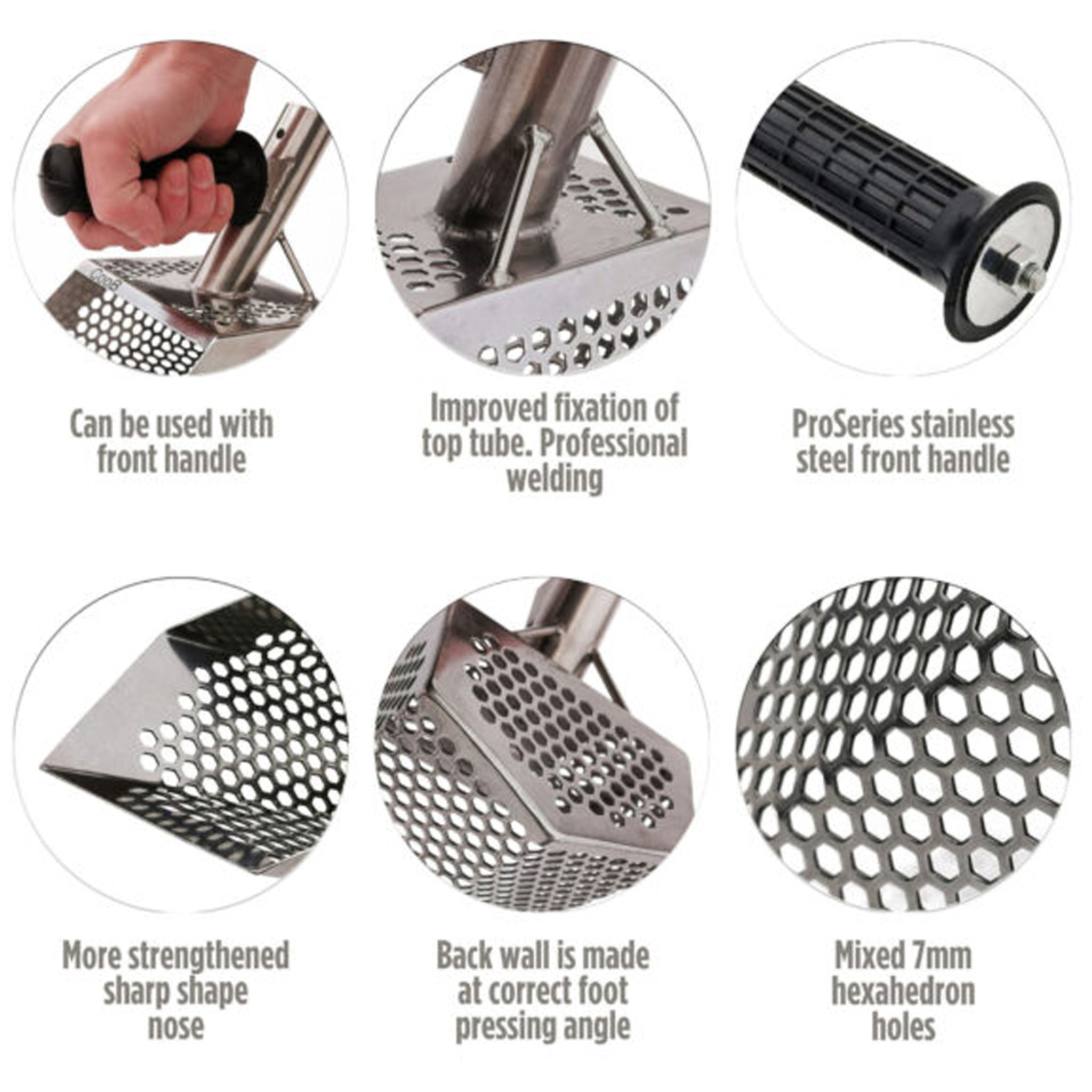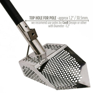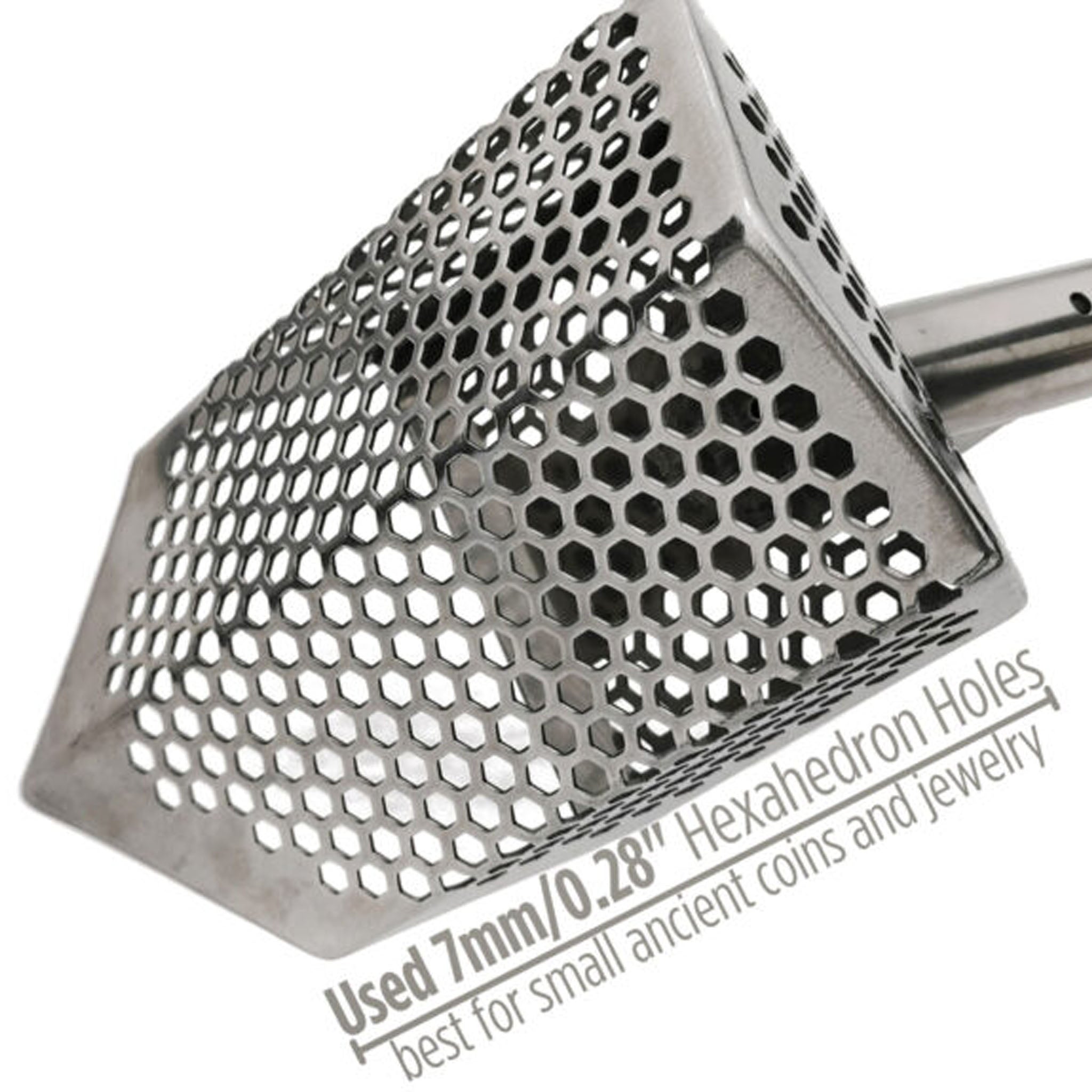 CooB 9" x 5.1" Stainless Steel Sand Scoop - Hexagon Holes - Your Gateway to Uncover Hidden Treasures! Discover ancient coins and exquisite jewelry with ease using our sand scoop. Designed with precision, this scoop features hexagon-shaped holes (7mm) for efficient sifting, ensuring no valuable artifact escapes your grasp.