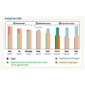 This coil is light and has excellent maneuverability, it is recommended for use on the beach, foundations of destroyed buildings, attics, wells and tunnels. This coil has good sensitivity to large, medium and especially small targets.