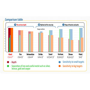 This coil is excellent for finding large targets as well as for small targets which are 1g or more at 25cm depth. This coil is superior to a standard coil in depth by 30%-60% (depending on the model of the metal detector) and in ground coverage of between 50%-80% (depending on the model of the metal detector).