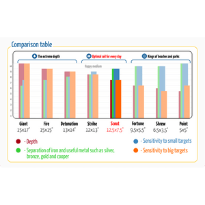 This coil is unusually light for its size, which makes it easy to search for a whole day. The coil is superior to a standard coil in depth by 5%-30% (depending on the model of the metal detector) and in ground coverage of between 25%-50% (depending on the model of the metal detector).