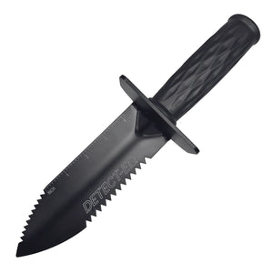 This digger is ideal for cutting through grass, soil, and even roots! The Detect-Ed Stealth Hand Digging Knife/Blade features a 7.5" (19cm) long Carbon Steel blade with serrated cutting-edge teeth, not just along the side but also on the leading edge (near the tip), allowing you to easily cut through roots that are directly in the way of the digger tip.