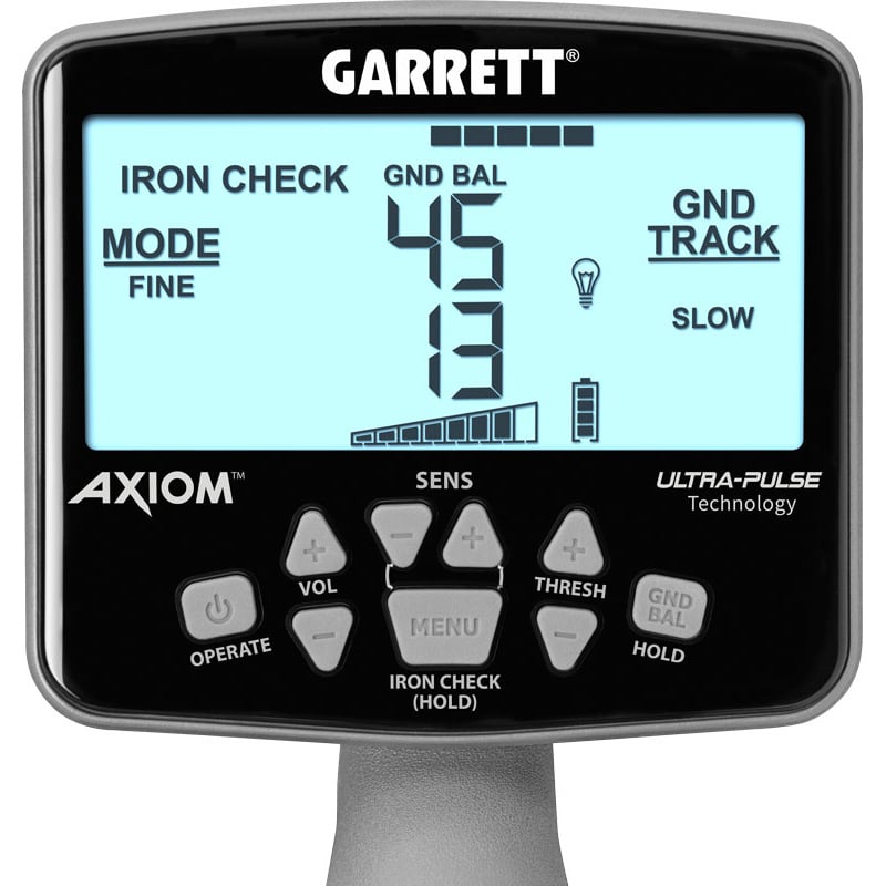 - Iron Check: This feature helps you audibly identify iron targets with the Axiom when using a DD search coil.