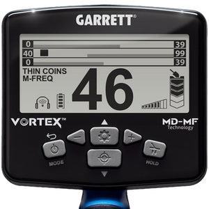 The Garrett Vortex VX9 model is the "Professional's" choice in the series. It features full three-tiered MD-MF Target ID display, which includes two ferrous scales for identifying unwanted iron trash. The VX9 also offers Multi-Salt and additional frequency options. Enhanced Recovery Speed controls and a FAST Mode make it ideal for competition hunts and high-trash areas. Additionally, the THIN COINS Mode is perfect for detecting fine, low-conductivity coins such as hammered silver and thin gold coins.