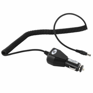 The car charger plugs into a 12 Volt DC automotive cigarette lighter socket for convenient, mobile charging when away from mains power.