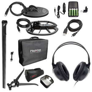 with Waterproof DD 11x7'' Search Coil, Waterproof 7.5x4'' DD Search Coil, Headphones, Carrying Bag, Protective Covers, Stand, Extra Lower Shaft, AC & Car Charger, 4 x AA Rechargeable Batteries & USB Cable