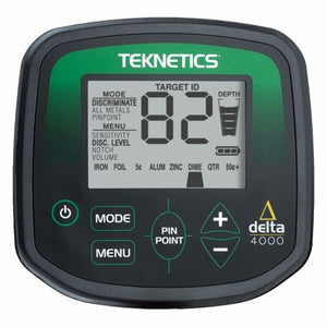 The Delta 4000 features Numeric Target ID, Multiple Notches, Pinpoint, Running Depth Display, 2 Search Modes, and Overload Alarm System.
