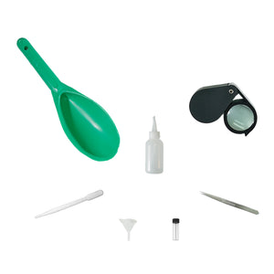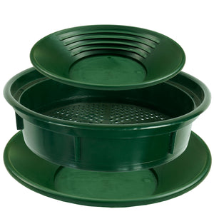 Everything you need to get started for fun and profit! Our Complete Gold Panning Kit includes all the essentials for an exciting gold prospecting adventure. This kit comes with a 10" plastic gold pan, a 14" plastic gold pan, and a 13 1/4" plastic classifier with 5/16 holes. It also includes a treasure scoop, fine point stainless steel tweezers, a snuffer bottle, a mini transfer funnel, a clear glass gold vial with lid, and a handy folding magnifier. Additionally, you’ll receive a pamphlet on how to pan for gold. Made from durable plastic material and available in black or green, this kit is proudly made in the USA. Start your gold panning journey today with this complete, high-quality kit!