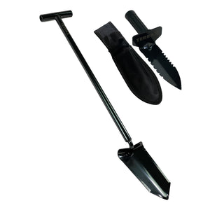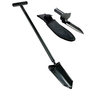 Uncover unparalleled efficiency and durability with the TerraX Master Digger Metal Shovel with a 6-inch T-Handle and Digging Knife with a belt sheath designed for professional landscaping, gardening, relic hunting, metal detecting, and gold prospecting - Durable. The sleek black color and high-quality steel construction ensure longevity and reliability in various environments. The T-Handle design of the shovel, with an overall length of your choice, 36 or 34 inches, provides optimal reach and control, while the 9.5-inch pre-sharpened edges deliver precision and versatility in digging through various terrains. The unique serrated edge of the hand digger enhances cutting performance, making it an ideal choice for efficient excavation. The shovel and digging knife strike the perfect balance between lightweight maneuverability and sturdiness. The rubber handle of the digging knife allows for prolonged use without discomfort, and the inclusion of a belted sheath adds convenience to your outdoor adventures. Elevate your metal detecting and outdoor exploration experience with the TerraX Shovel and Digging Knife combo.