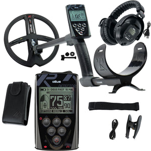 XP Deus Metal Detector with 9″ X35 DD Waterproof Wireless Search Coil, Coil Cover, WS5 Wireless Full Sized Headphones, Wireless Remote Control Display Screen, Hip mount case for Remote Control, and a 5 Year Parts and Labor Warranty.