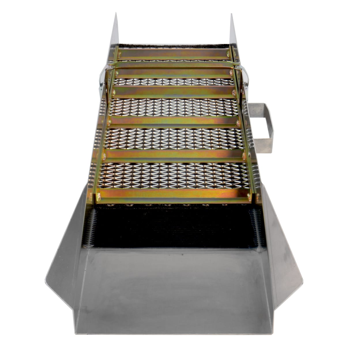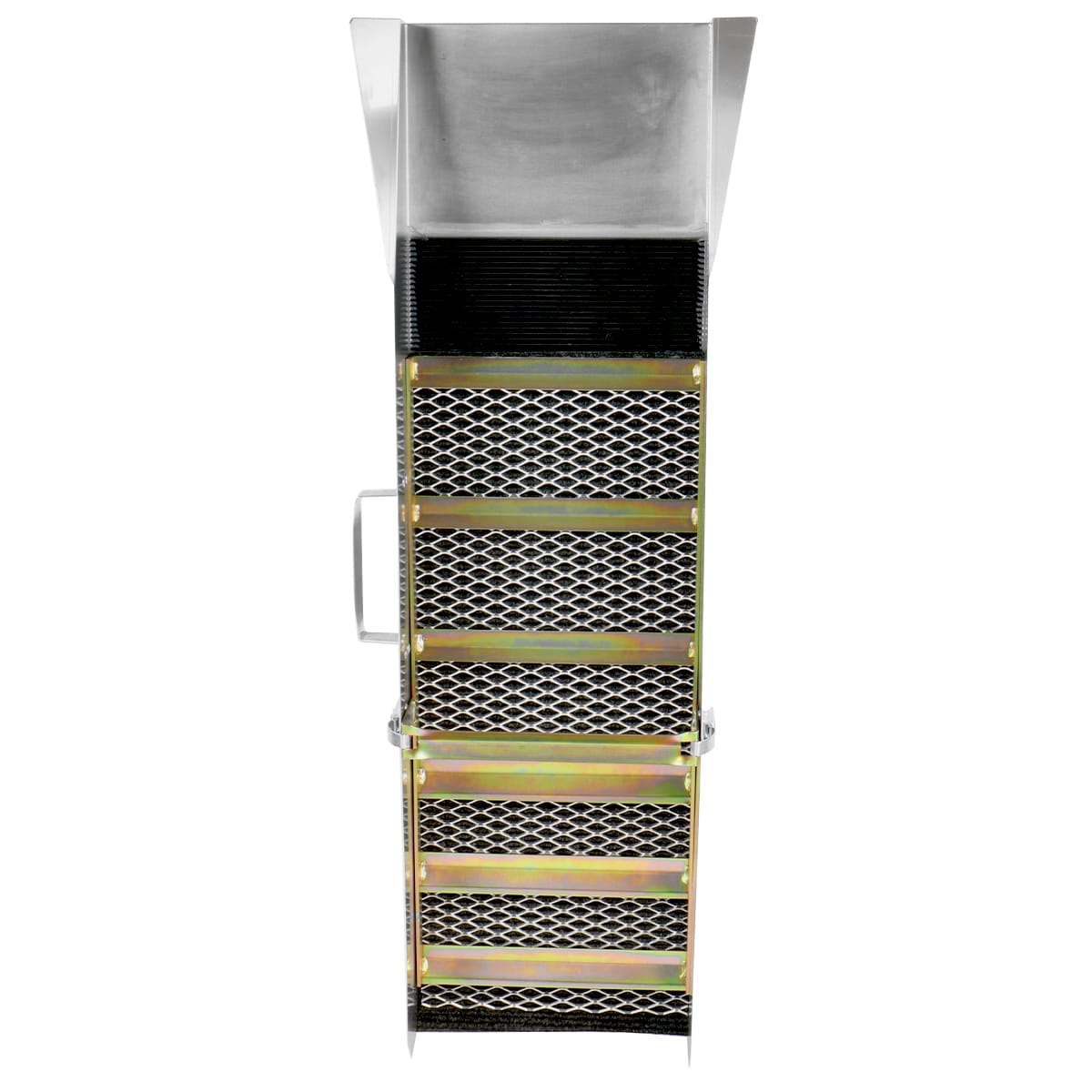 Two different types of riffles on this sluice were designed for superior recovery under different water and gravel conditions. The first few riffles are stream riffles, which are shorter and designed to work with minimum water flow. Stream riffles make it easier for the water to start to move the material. Hungarian riffles work better with a more aggressive volume of water. Together, both types of riffles are designed to create turbulence that deposits the gold and other heavier values behind them.